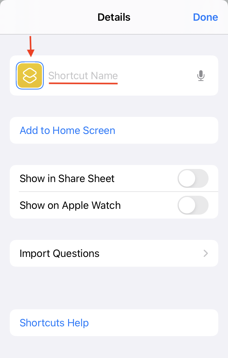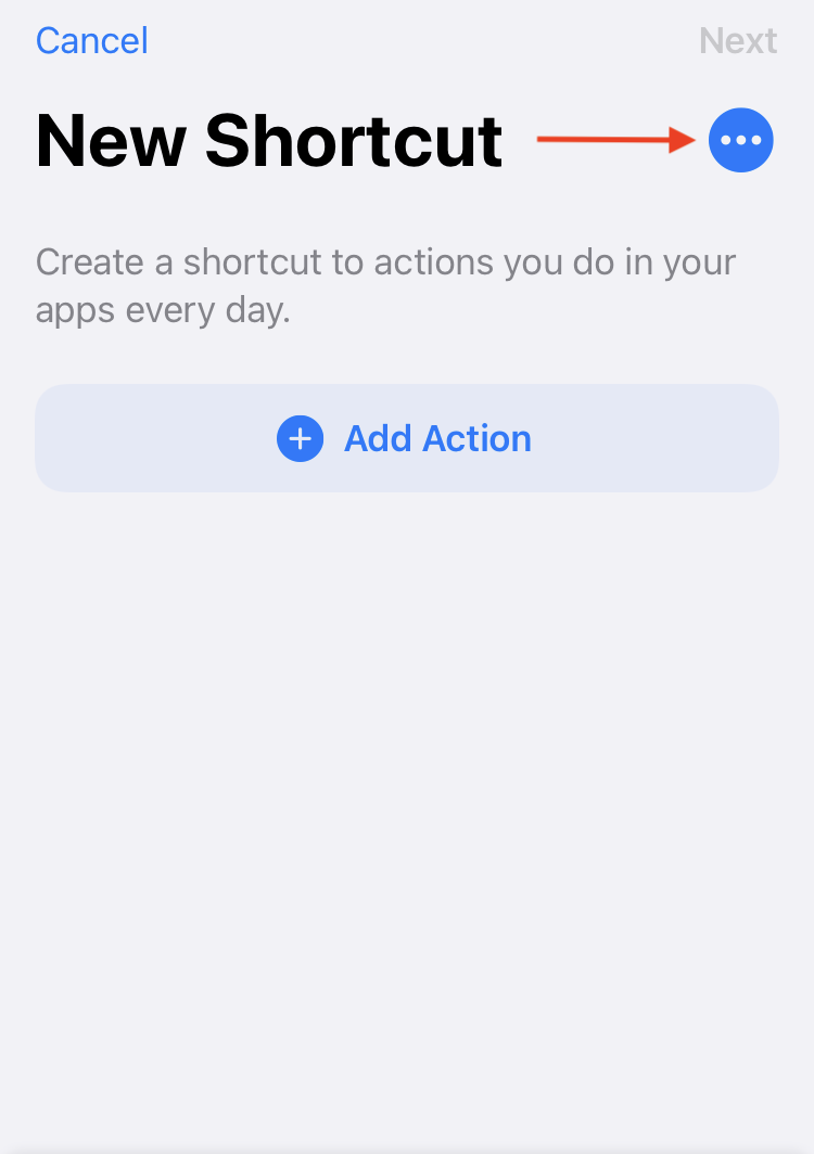 Next, head over to the Shortcuts app to create a new shortcut. On the “My Shortcuts” landing page, tap on the big plus sign (+) in the top right-hand corner and you’ll be presented with your new shortcut screen. You’ll need to give the shortcut a name, so tap on the three-dot (…) menu and then give your shortcut an appropriate name. You can even change the icon’s look by tapping on it and changing the settings. I named mine “Spotify” as shown below: