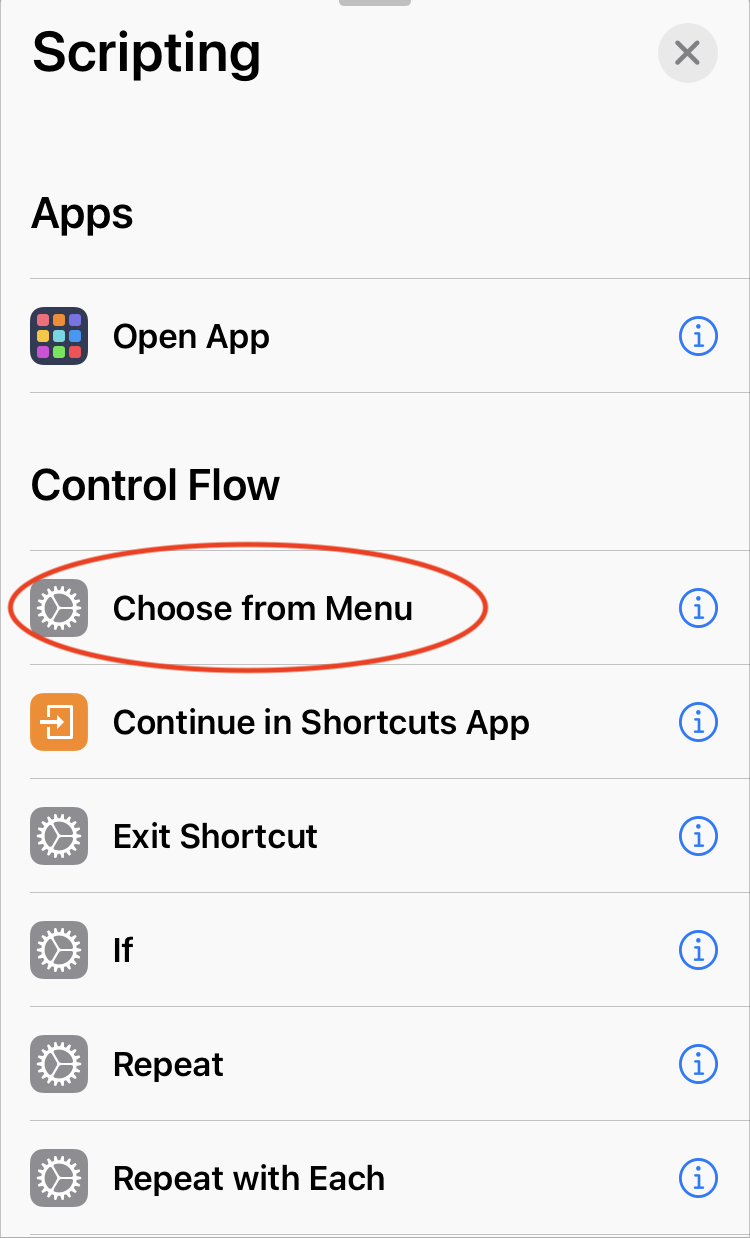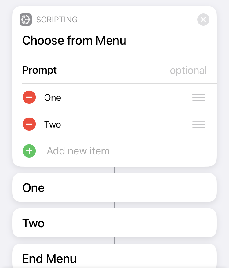 You’ll probably need access to more than one Spotify playlist, so we need to create a list containing all the playlists that you want to access quickly. To create this list within your shortcut, you’ll need to add a menu command. Tap on the “Add Action” button or simply tap on the search bar on the bottom of the screen to pull up a list of all the actions. Look for the “Scripting” section and then select the “Choose from Menu” option. Your shortcut should now have a blank menu selector as shown below.