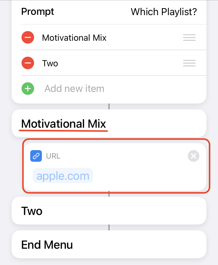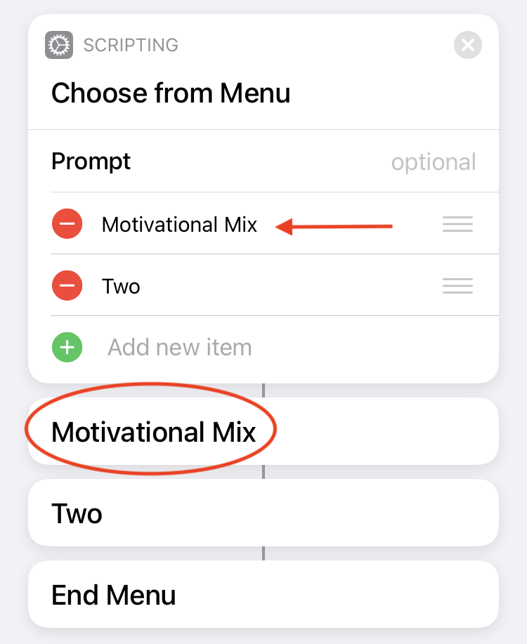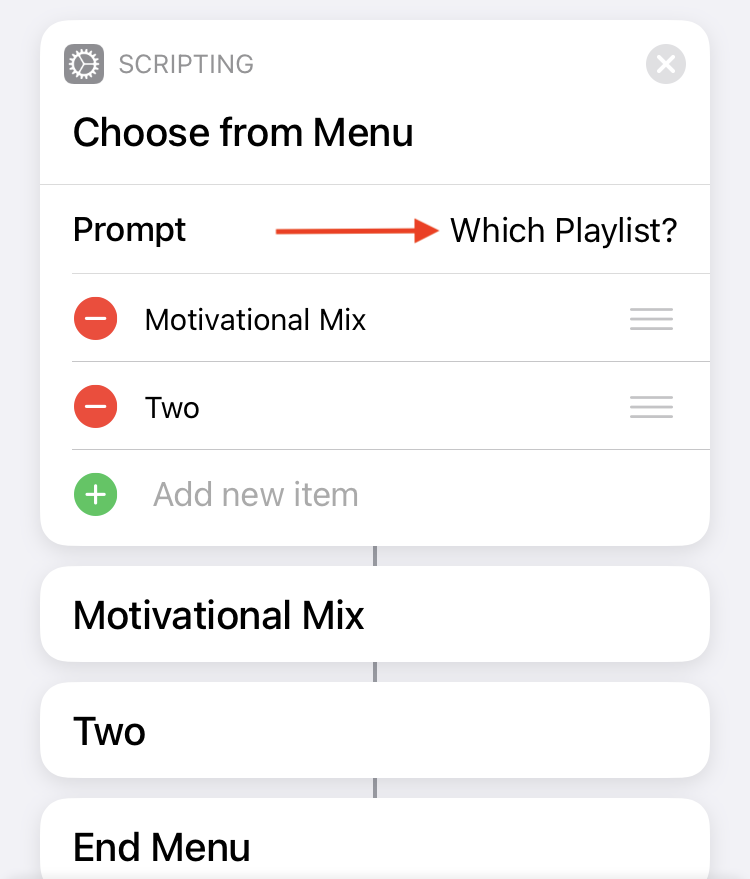 You’ll need to change the Menu items to reflect the names of the playlists that you want to include in your shortcut. Simply tap on the name within the prompt section and give it a name. Note how the menu item lower down on the screen changes in accordance with this update. You can also give your prompt a description, but that’s just an optional extra.